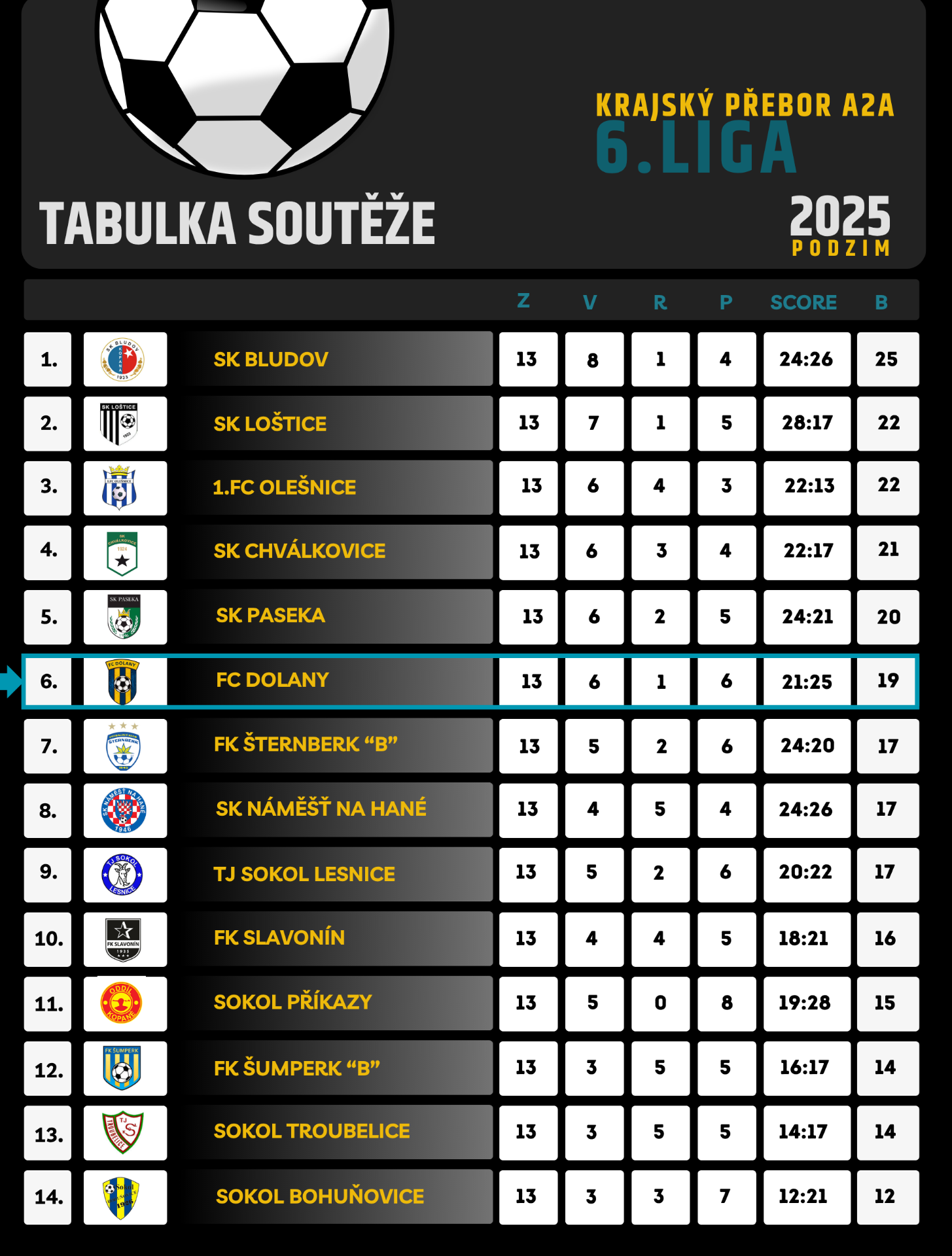 Sezóna 2025 je za námi a my chceme ze srdce poděkovat všem hráčům A-týmu FC Dolany za jejich nasazení, bojovnost a týmového ducha! Díky vaší práci a odhodlání jsme letošní soutěž zakončili na výborném 6. místě s 19 body – skvělý výsledek, na který můžeme být právem hrdí.