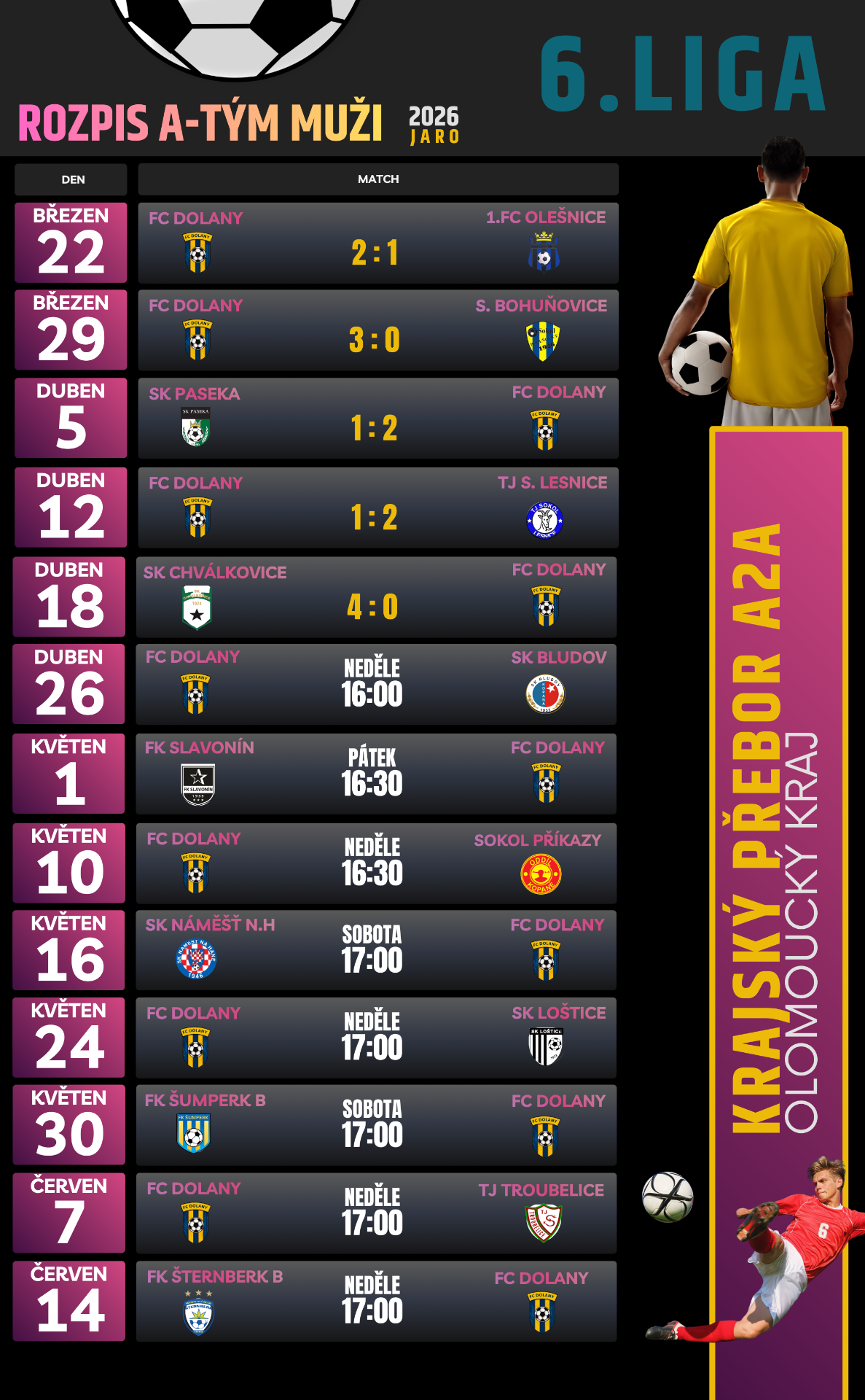 Senzační závěrečný zápas sezóny odehrál v neděli, na hřišti soupeře A-tým FC Dolany. Hned od začátku se náš tým ujal vedení a gól za gólem navršoval náskok až do 60.minuty, kdy za stavu 0 : 5 soupeř skóroval prvním ale i posledním gólem. Výsledek 1 : 6 týmu přinesl tři body, Mužstvo končí s 50 body na 5.mistě v tabulce. Gratulujeme!